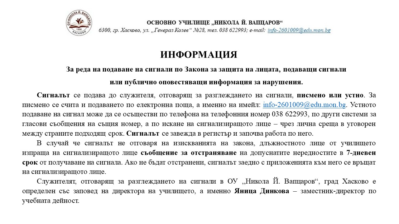 Информация за реда на подаване на сигнали по Закона за защита на лицата, подаващи сигнали