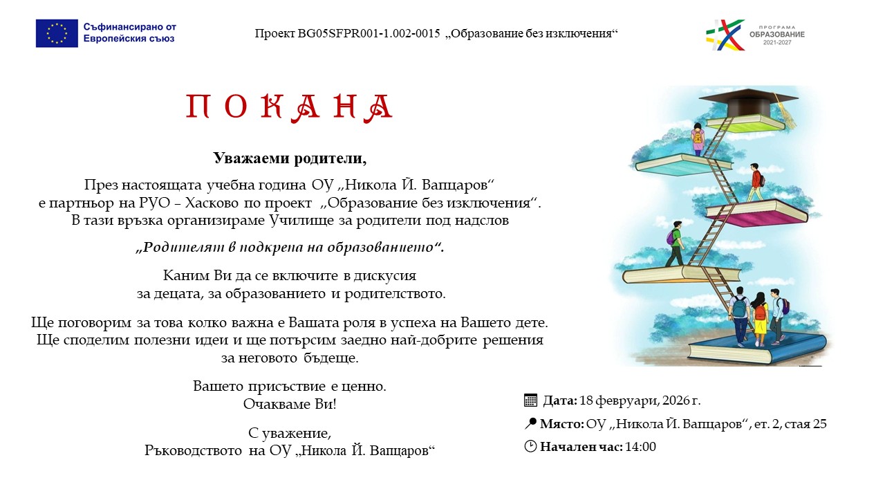 Покана за училище за родители по проект "Образование без изключения"