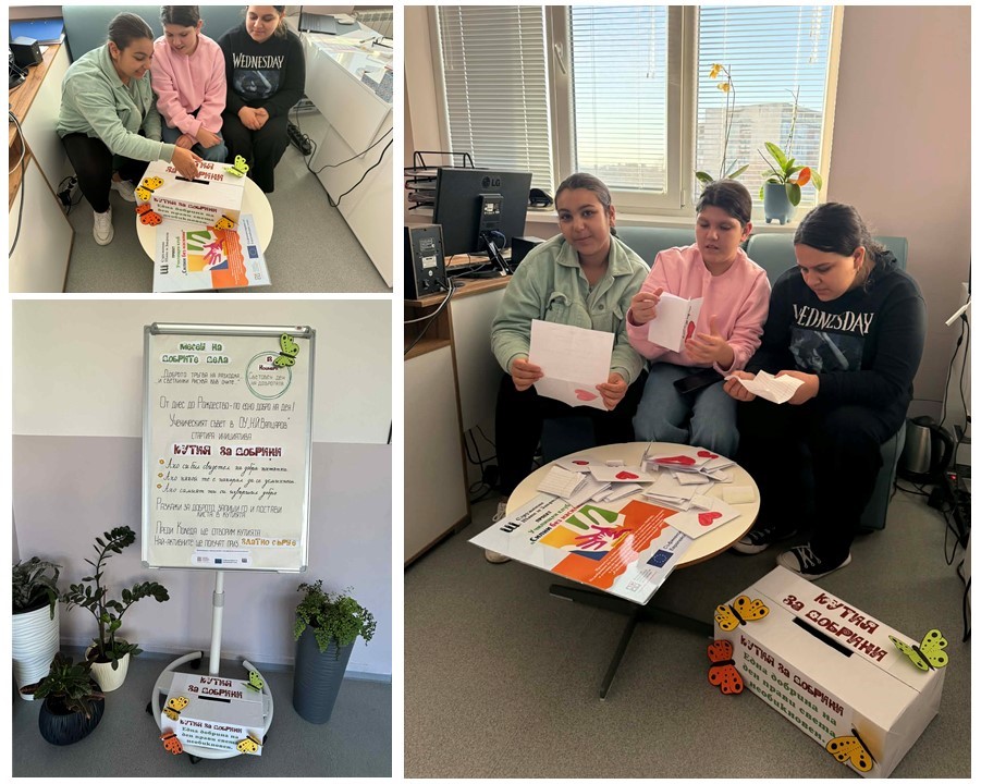 Кутията за добрини, разположена във фоайето на втория етаж, бързо се напълни с десетки послания, описващи малки и големи жестове на внимание, помощ и приятелство. Учениците споделяха за това как са помогнали на съученик, подкрепили са приятел, уважили са по-малките, проявили са съпричастност и доброта в ежедневието си.